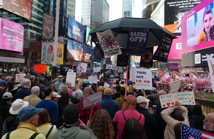 In New York City, Times Square teemed with protesters, waving American flags, holding witty signs, and chanting “No Kings in America!” In New York alone, organizers estimated more than 300,000 people showed up.